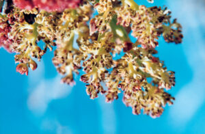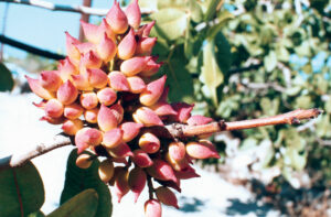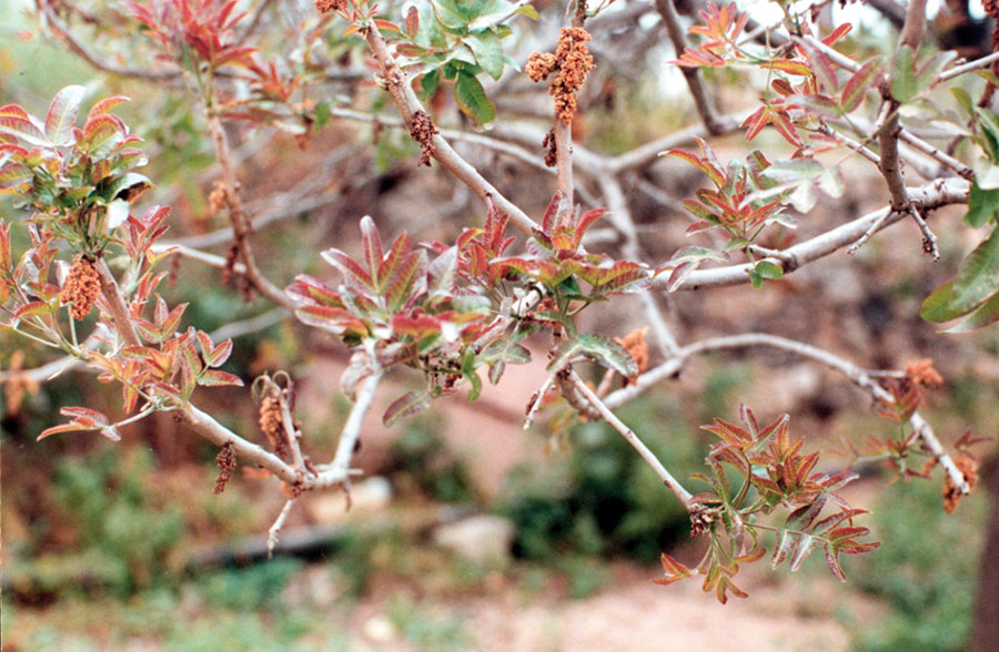 Οι οφθαλμοί αρχίζουν να φουσκώνουν στις αρχές Απριλίου (εικ. 3). Η θηλυκή φιστικιά ανθίζει το πρώτο δεκαπενθήμερο του Απρίλη (εικ. 4 – Θηλυκές ταξιανθίες έτοιμες για γονιμοποίηση). Για να γονιμοποιηθεί χρειάζεται και αρσενικά δέντρα των οποίων η γύρη μεταφέρεται με τον αέρα (εικ. 5 – Αρσενική φιστικιά. Η γύρη έχει διασκορπιστεί και οι ταξιανθίες έχουν μαραθεί).