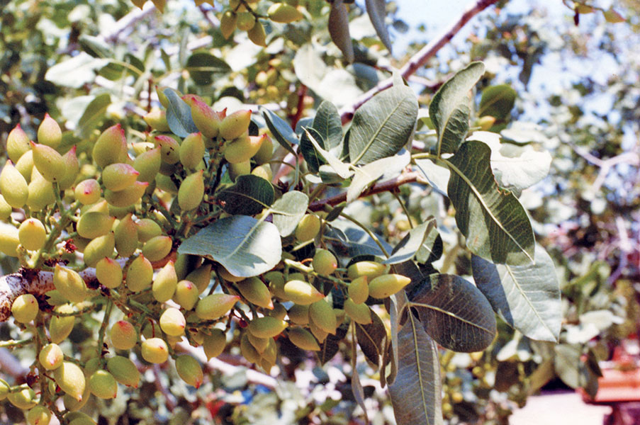 Το δεύτερο δεκαπενθήμερο του Απριλίου τα φιστίκια μόλις έχουν δέσει (εικ. 6). Στο τέλος Ιούλιου οι καρποί είναι ακόμα άγουροι (εικ. 7) αλλά το τσόφλι έχει ξυλοποιηθεί και συνεχίζεται η ανάπτυξη του σπέρματος που έχει εμφανιστεί από τις αρχές Ιουνίου. Οι γεμάτοι καρποί κατά την ωρίμανση αποκτούν μια ροζ-κόκκινη απόχρωση στο τμήμα που βλέπει ο ήλιος (εικ. 9). Όταν ο φλοιός γίνει μαλακός και ξεκολλάει από το τσόφλι εύκολα, αρχίζει η συγκομιδή, τέλη Αυγούστου μέχρι Σεπτέμβρη. Στη συγκομιδή χρησιμοποιούνται ξύλινα ραβδιά ντυμένα στην άκρη με λάστιχα ή πανιά για να μην τραυματίζονται τα δέντρα. Κάτω από τα δέντρα απλώνονται πανιά (εικ. 10) απ’ όπου συλλέγονται και τσουβαλιάζονται οι καρποί που οδηγούνται όσο το δυνατόν γρηγορότερα στις αποφλοιωτικές μηχανές για να μη μαυρίσει το τσόφλι και δεν είναι εμπορεύσιμοι.